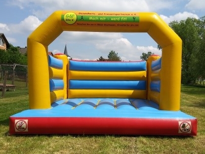 Sie hat eine stabile Springfläche und leuchtet in hellen Farben. Außerdem ist sie sehr gut einsehbar. Die Hüpfburg hat kein Dach. Sie eignet sich besonders für große Events, Feste oder Vereinsfeiern. Aufgrund der relativ geringen Höhe wäre auch der Einsatz Indoor möglich.